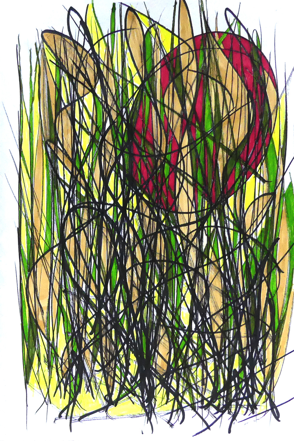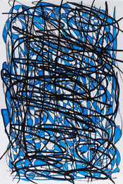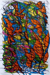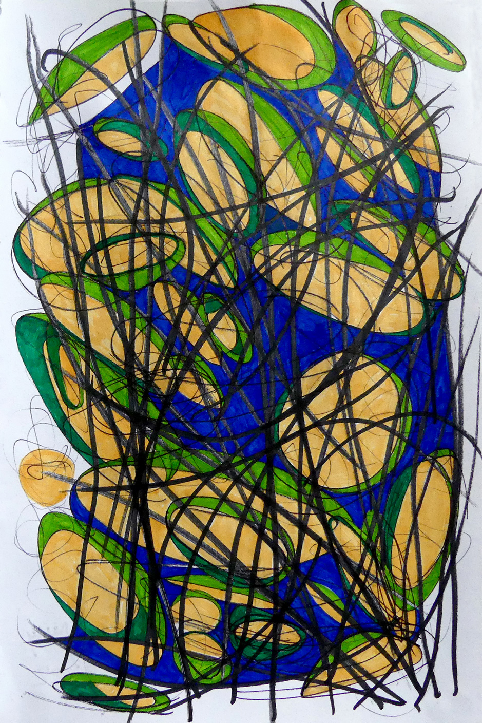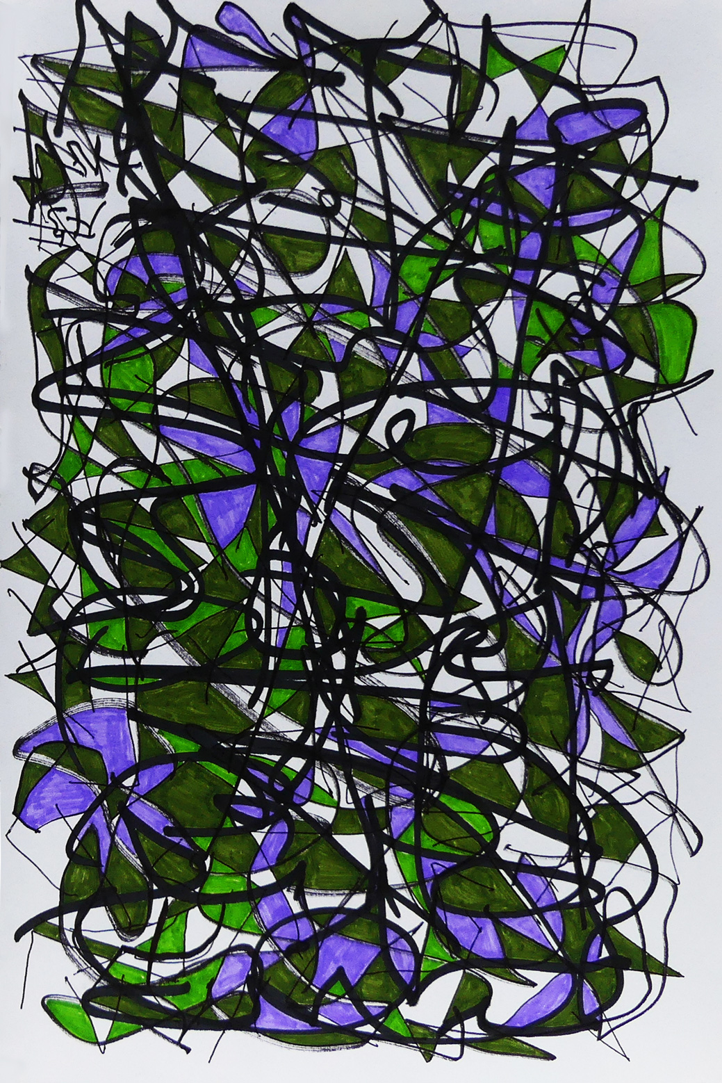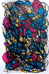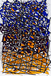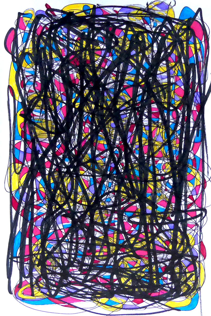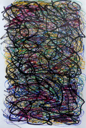 L’ordre constructif des dessins est inversé par rapport aux peintures. Ce ne sont plus les traces qui dominent un arrière-plan coloré, mais une association de couleurs au premier plan qui transforme le tracé labyrinthique d’une trame faite de trois épaisseurs de lignes plus ou moins fermées en une image ordonnée et paysagère ou au contraire abstraite et sans apparence.