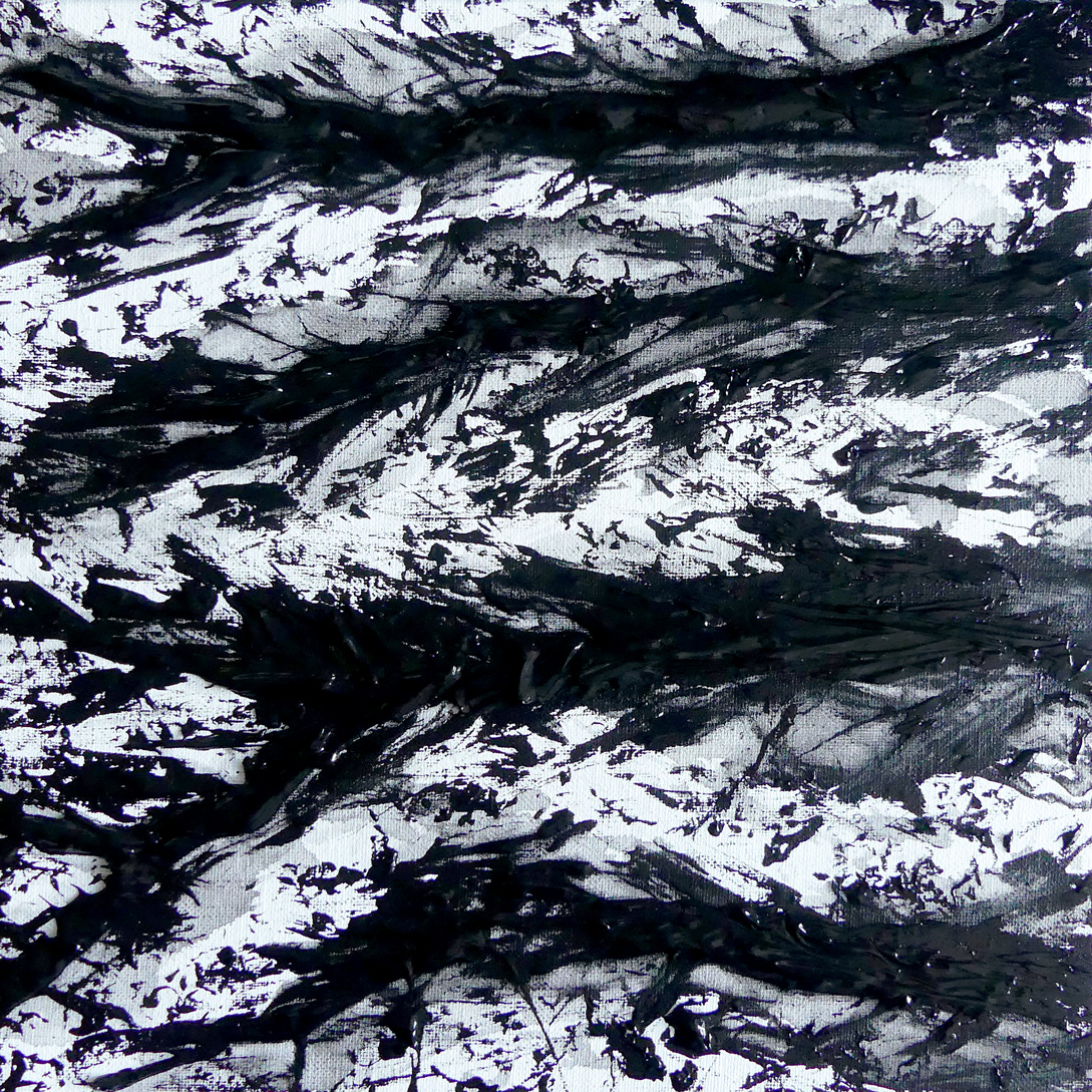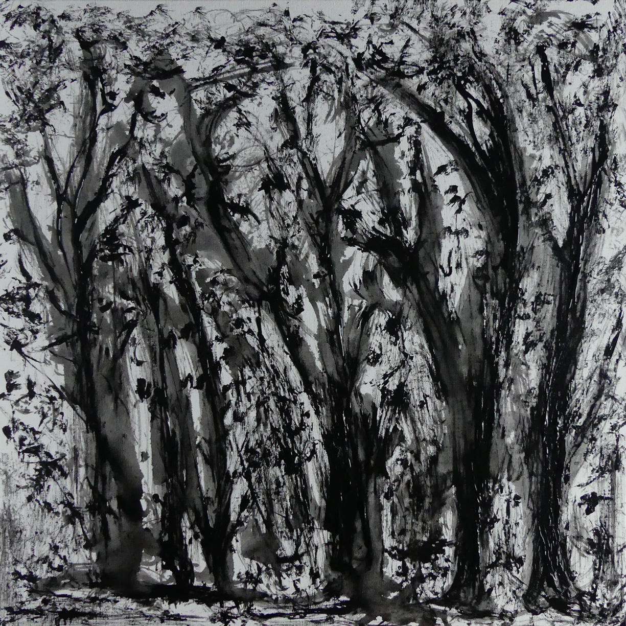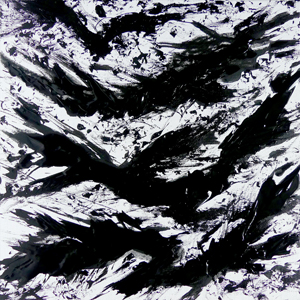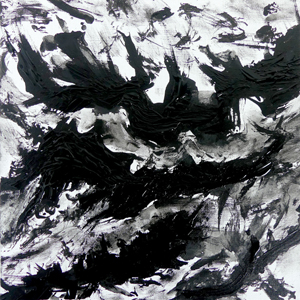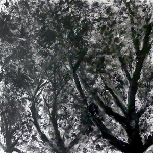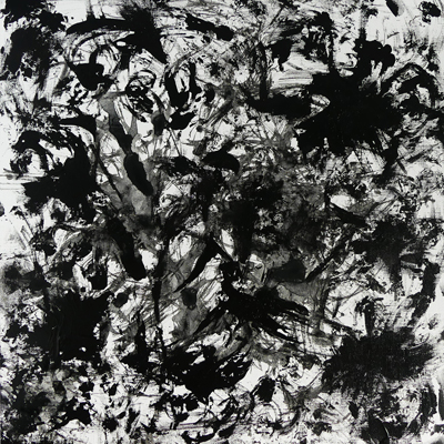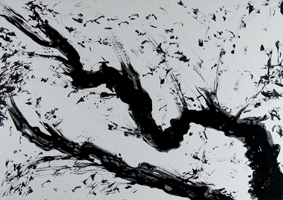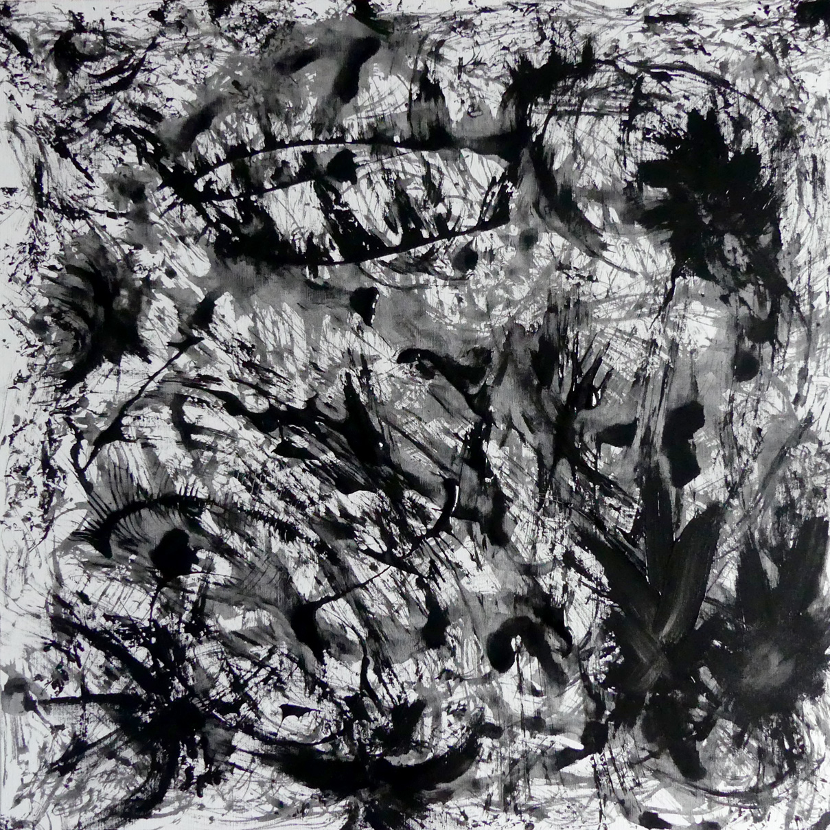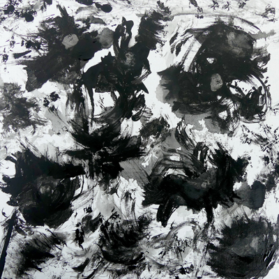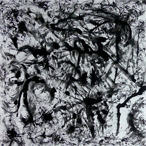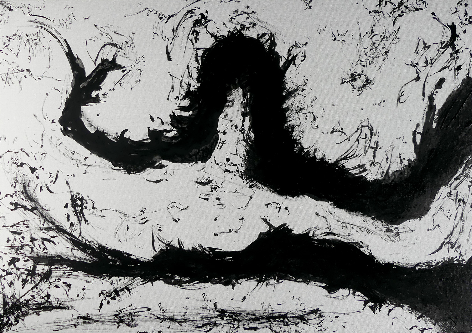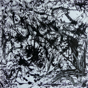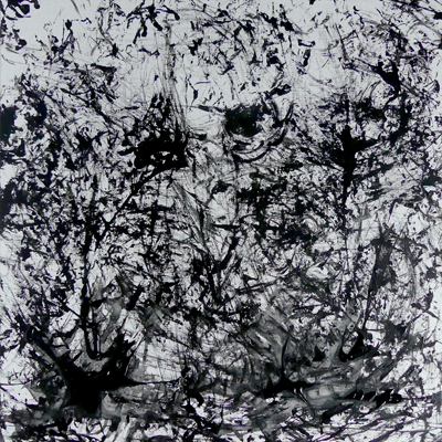 Le blanc tramé de la toile reçoit les coulures d'une peinture diluée comme une encre de