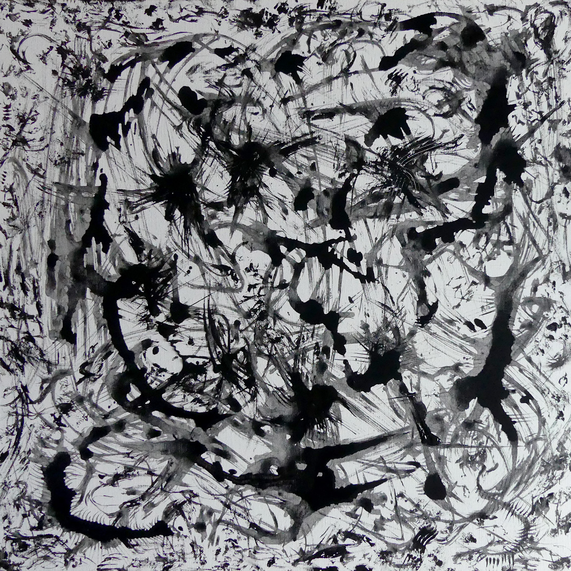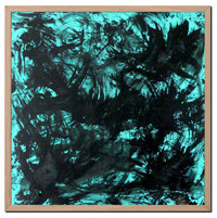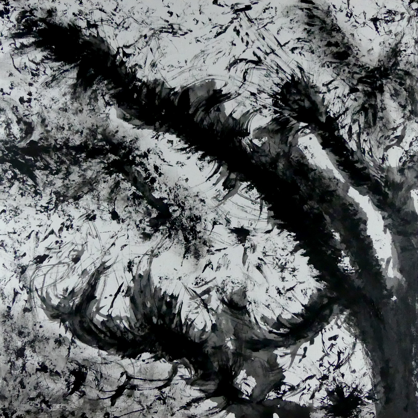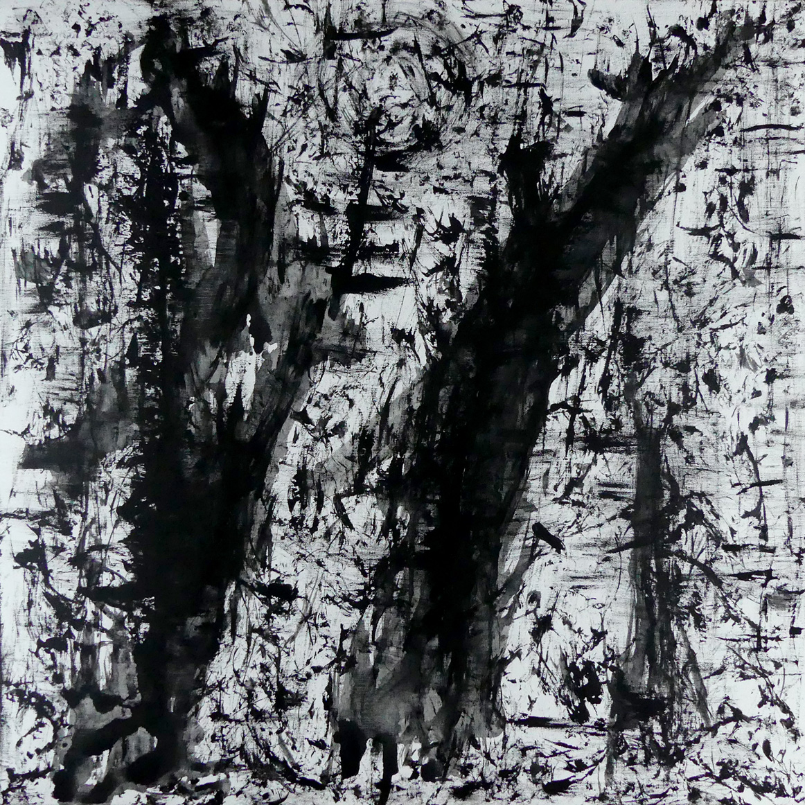 Le blanc tramé de la toile reçoit les coulures d'une peinture diluée comme une encre de