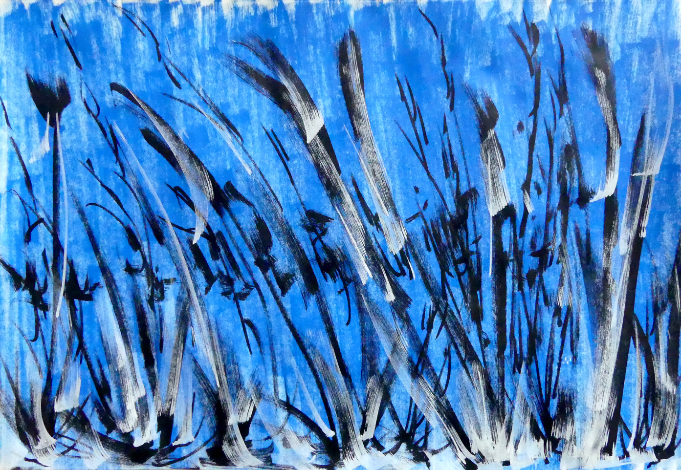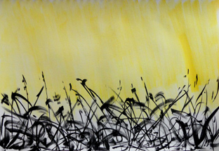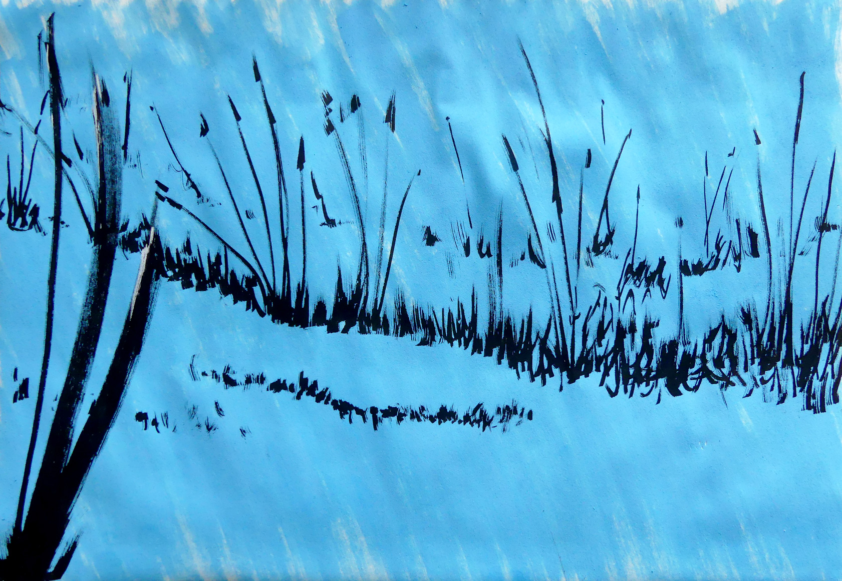 colorant la terre de brun et du blond de la paille, et d'azur le ciel presque blanc.